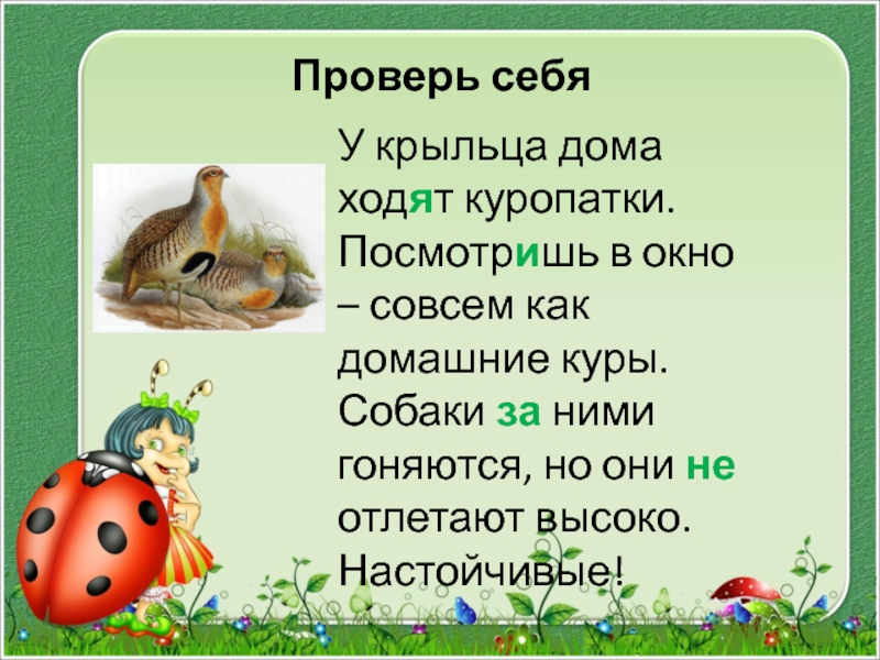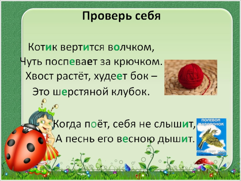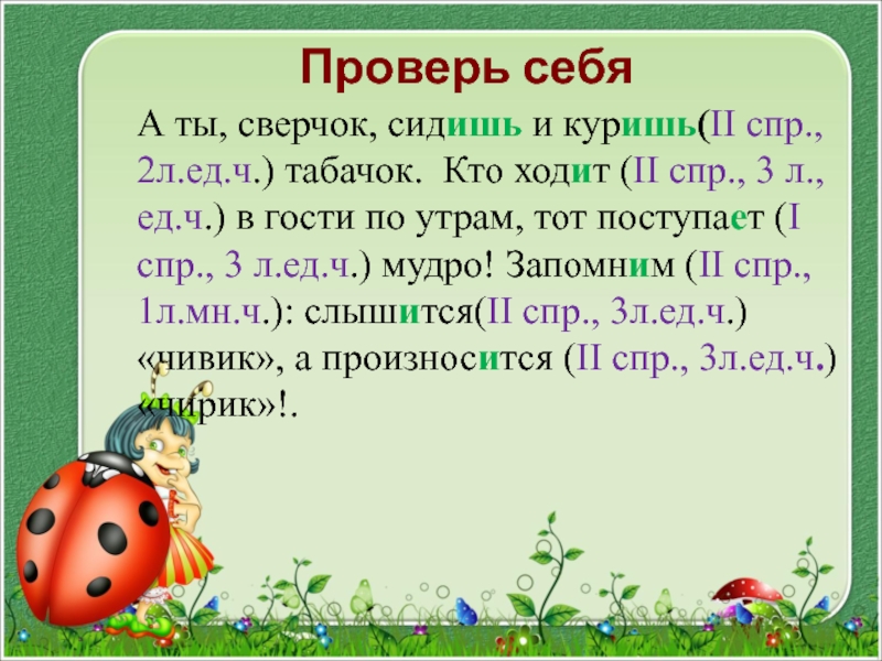 ед.ч.) в гости по утрам, тот поступает (I спр., 3 л.ед.ч.) мудро! Запомним (II спр., 1л.мн.ч.): слышится(II спр., 3л.ед.ч.) «чивик», а произносится (II спр., 3л.ед.ч.) «чирик»!.
