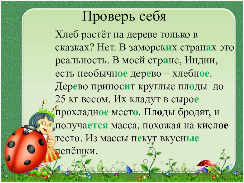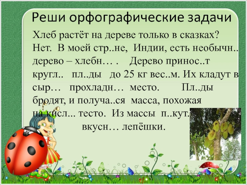 Индии, есть необычн.. дерево – хлебн… . Дерево принос..т кругл.. пл..ды до 25 кг вес..м. Их кладут в сыр… прохладн… место. Пл..ды бродят, и получа..ся масса, похожая на кисл... тесто. Из массы п..кут.