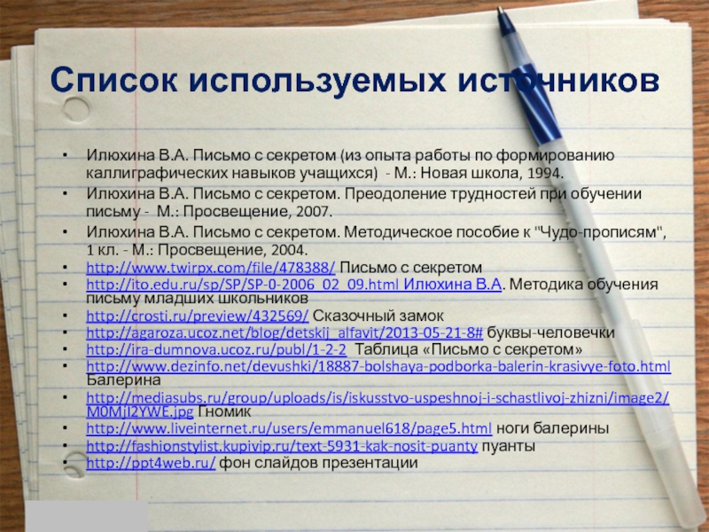 Илюхина В.А. Письмо с секретом. Преодоление трудностей при обучении письму - М.: Просвещение, 2007.