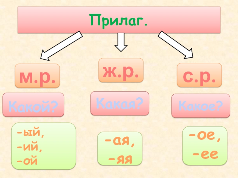 Прилаг.          м.р.ж.р.с.р.Какой? Какая? Какое?-ый, -ий,-ой -ая, -яя -ое,