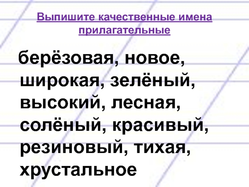 Выпишите качественные имена прилагательные берёзовая, новое, широкая, зелёный, высокий, лесная, солёный, красивый, резиновый, тихая, хрустальное