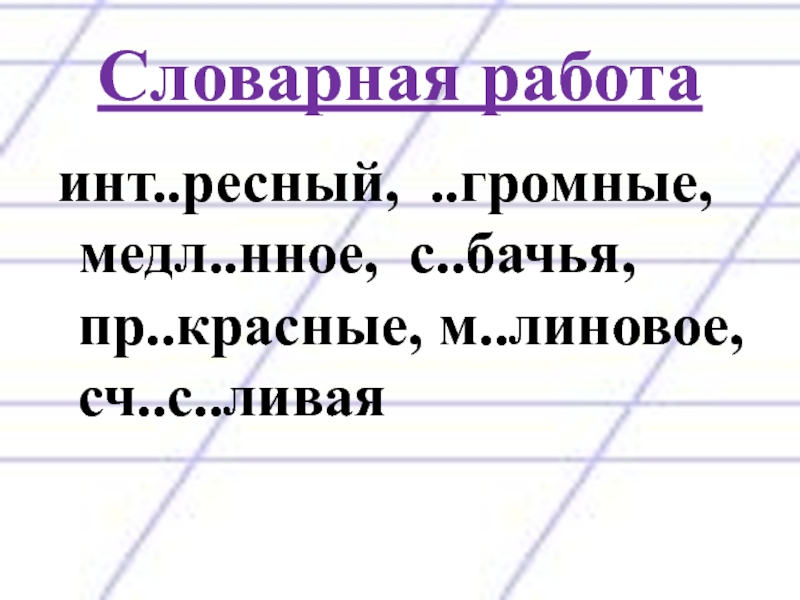 Словарная работа инт..ресный, ..громные, медл..нное, с..бачья, пр..красные, м..линовое, сч..с..ливая