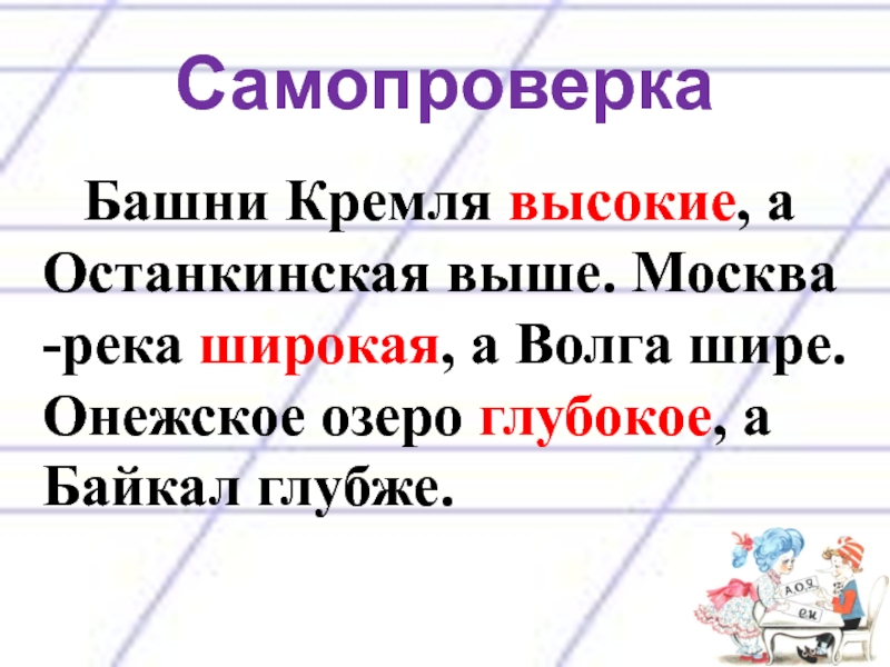 Самопроверка   Башни Кремля высокие, а Останкинская выше. Москва -река широкая, а Волга шире. Онежское озеро