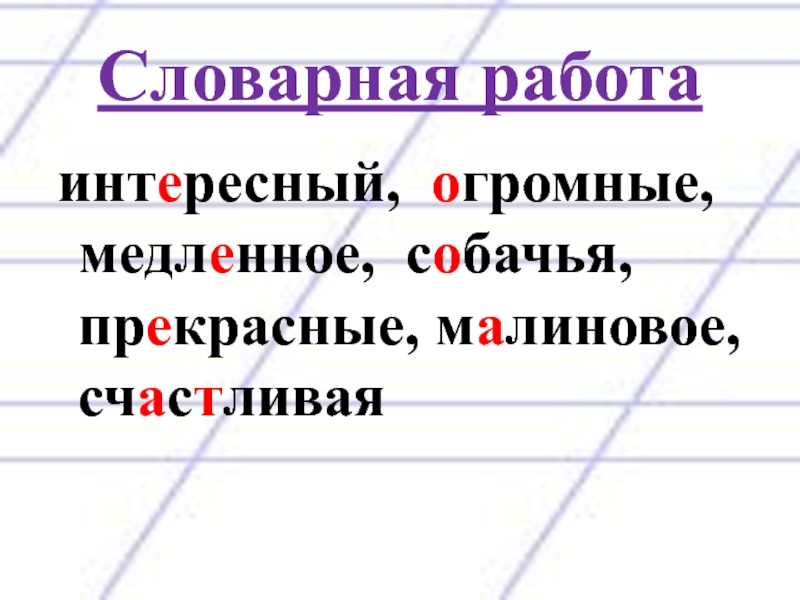 Словарная работа интересный, огромные, медленное, собачья, прекрасные, малиновое, счастливая