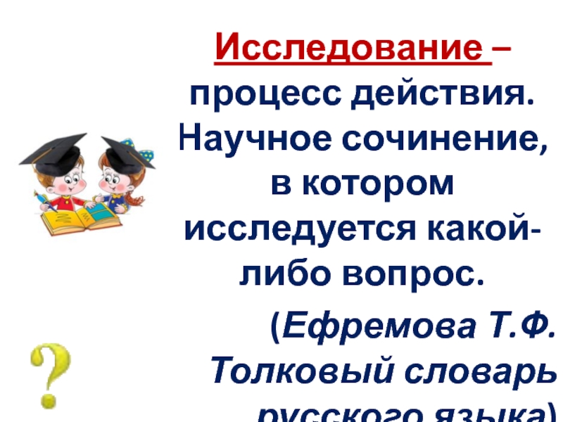 Слайд 2Исследование – процесс действия. Научное сочинение, в котором исследуется какой-либо вопрос.