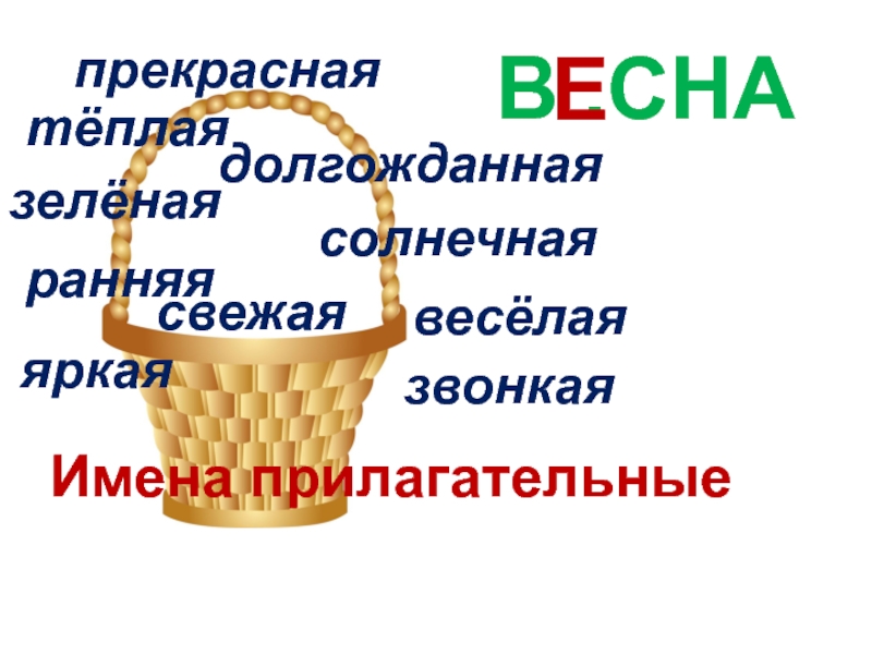 В .СНА Е тёплаядолгожданнаясолнечнаяпрекраснаязелёнаясвежаяранняявесёлаязвонкаяяркаяИмена прилагательные