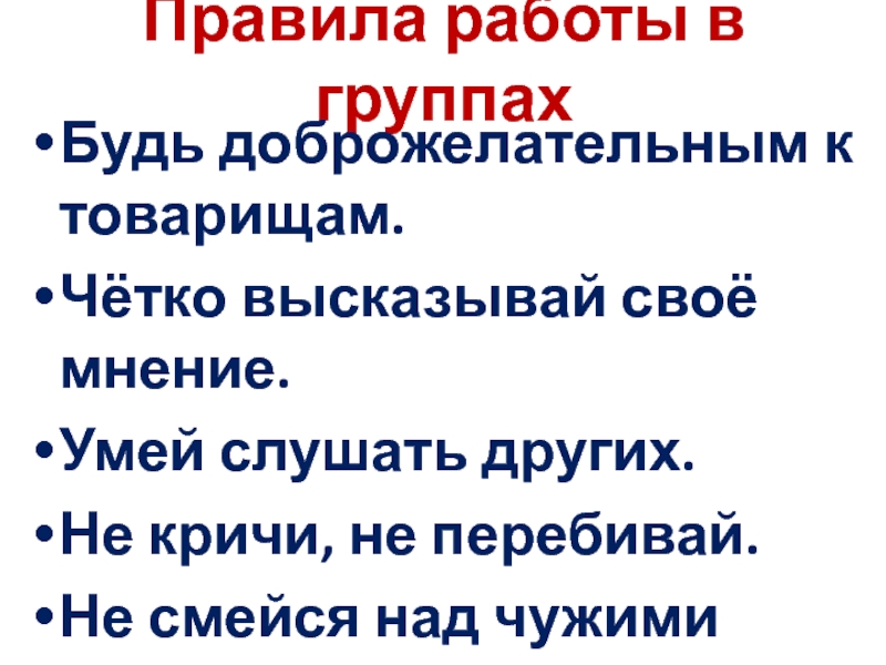 Правила работы в группахБудь доброжелательным к товарищам.Чётко высказывай своё мнение.Умей слушать других.Не кричи, не перебивай.Не смейся над