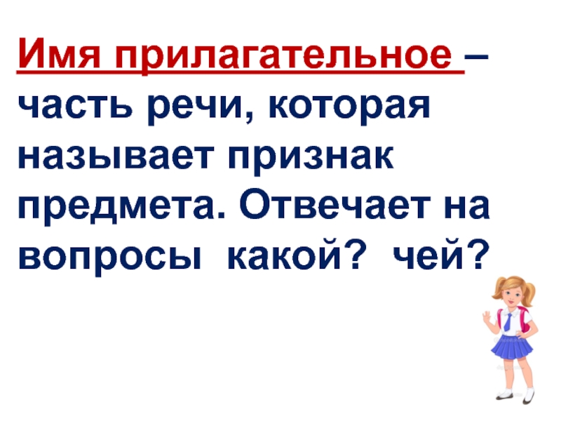 Слайд 13Имя прилагательное – часть речи, которая называет признак предмета. Отвечает на