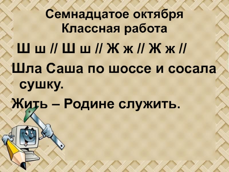 Семнадцатое октября Классная работа Ш ш // Ш ш // Ж ж // Ж ж //Шла Саша по шоссе и сосала сушку.Жить – Родине