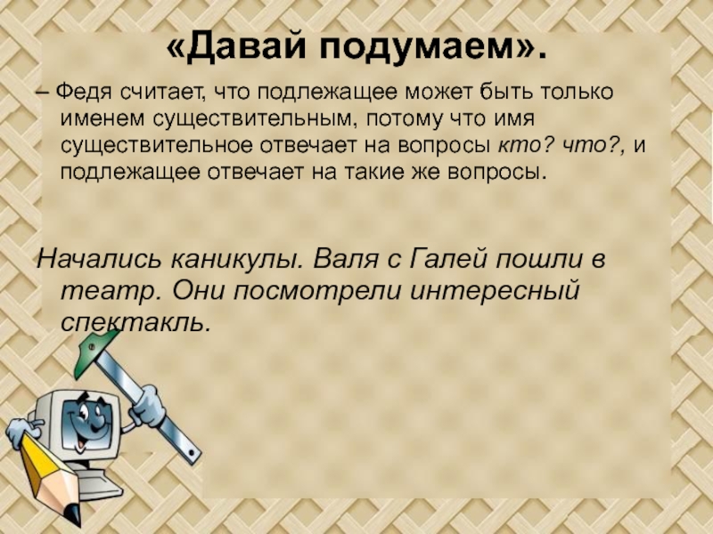 «Давай подумаем».  – Федя считает, что подлежащее может быть только именем существительным, потому что имя