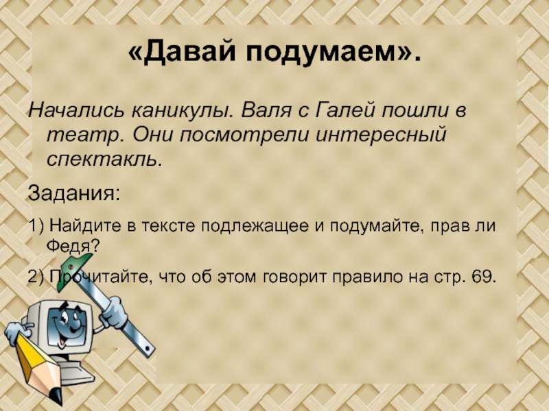 «Давай подумаем».Начались каникулы. Валя с Галей пошли в театр. Они посмотрели интересный спектакль.Задания:1) Найдите в тексте подлежащее