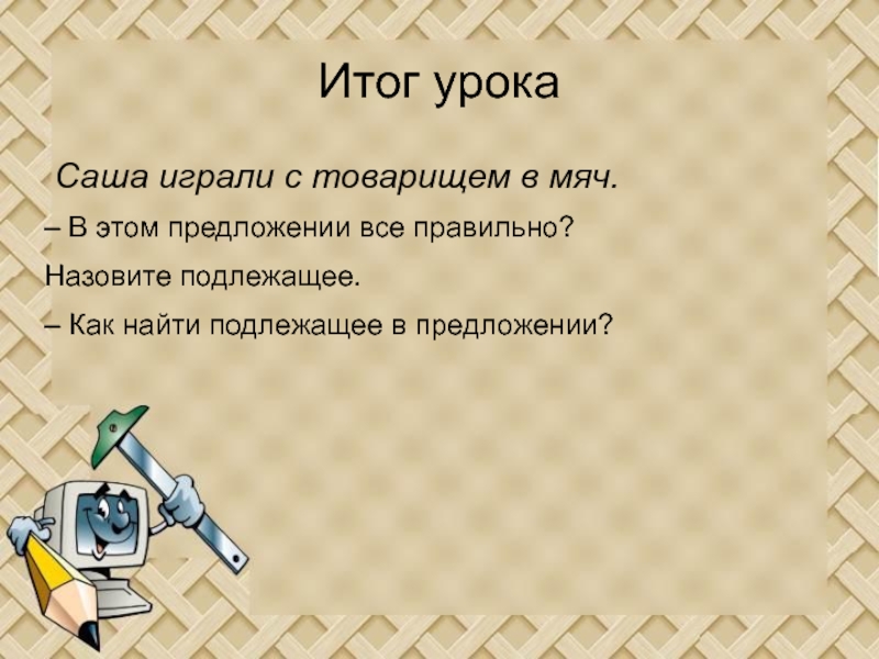 Итог урока Саша играли с товарищем в мяч.– В этом предложении все правильно?Назовите подлежащее.– Как найти подлежащее в
