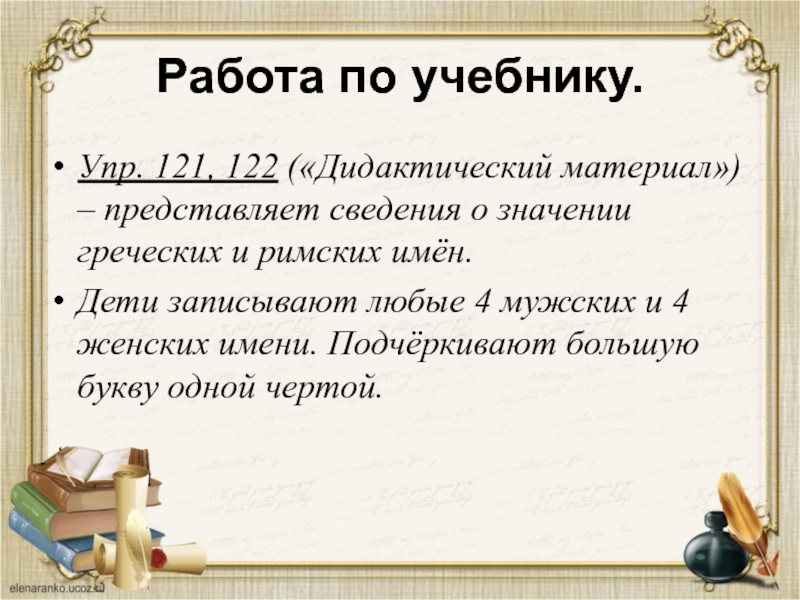 Работа по учебнику.Упр. 121, 122 («Дидактический материал») – представляет сведения о значении греческих и римских имён.Дети записывают