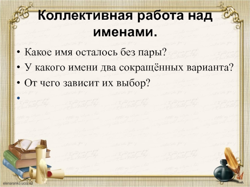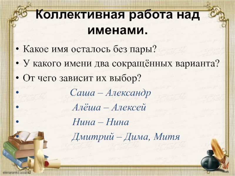 Коллективная работа над именами.Какое имя осталось без пары?У какого имени два сокращённых варианта? От чего зависит их