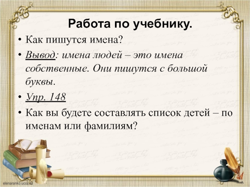 Работа по учебнику.Как пишутся имена?Вывод: имена людей – это имена собственные. Они пишутся с большой буквы.Упр. 148Как