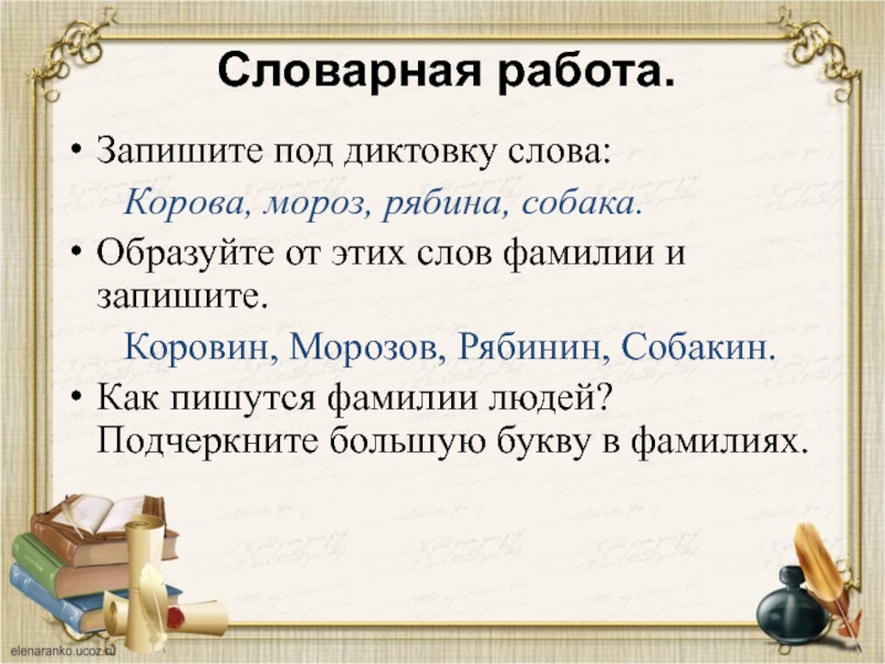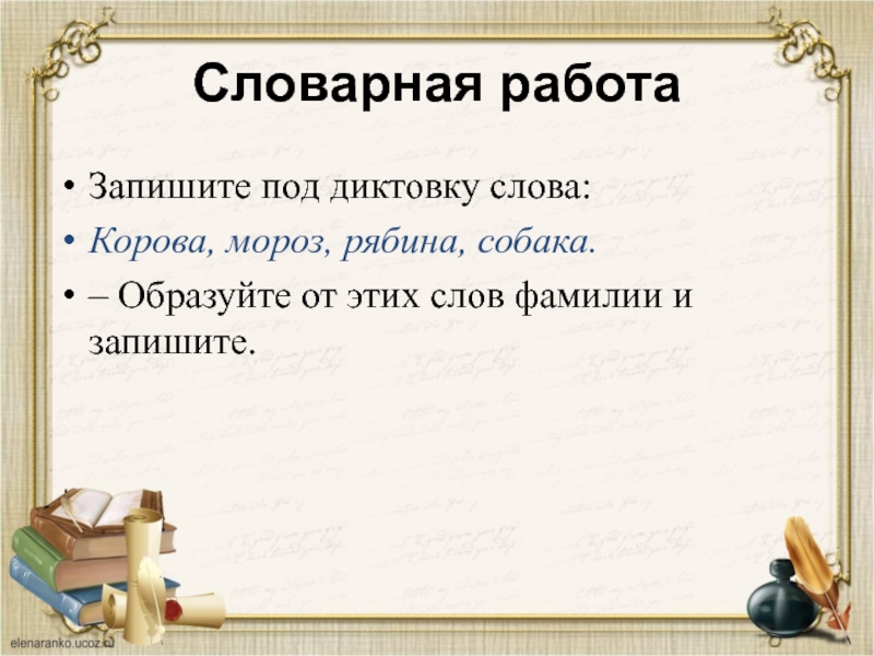 Словарная работаЗапишите под диктовку слова:Корова, мороз, рябина, собака.– Образуйте от этих слов фамилии и запишите.