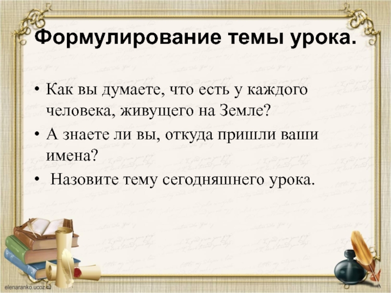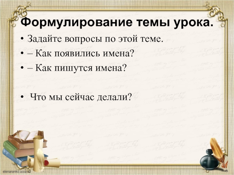 Формулирование темы урока.Задайте вопросы по этой теме.– Как появились имена?– Как пишутся имена? Что мы сейчас делали?