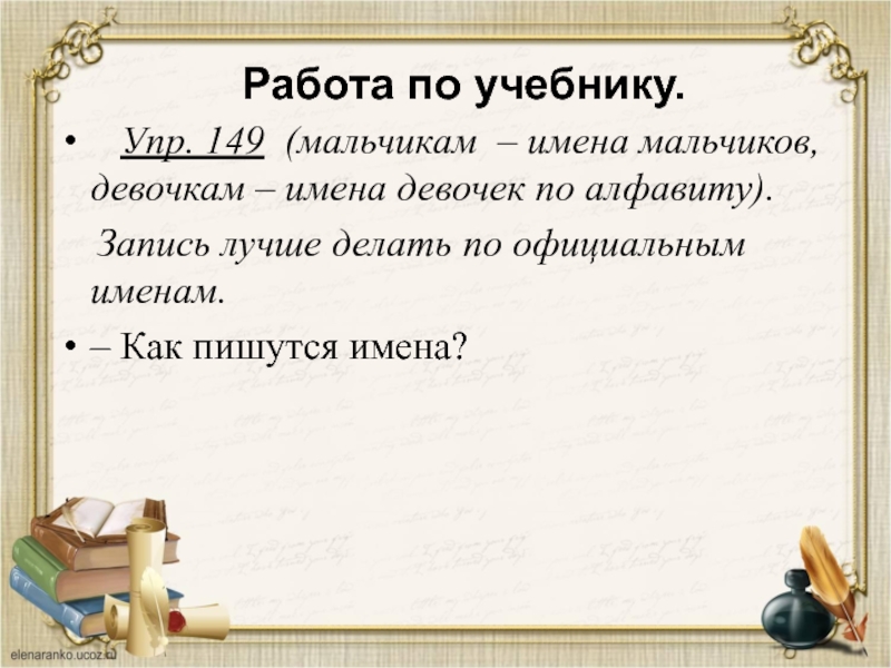 Работа по учебнику.  Упр. 149 (мальчикам – имена мальчиков, девочкам – имена девочек по алфавиту).