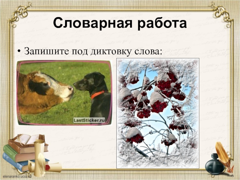 Словарная работа. Запишите под диктовку слова:   Корова, мороз, рябина, собака.Образуйте от этих слов фамилии и