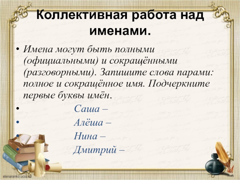 Коллективная работа над именами.Имена могут быть полными (официальными) и сокращёнными (разговорными). Запишите слова парами: полное и сокращённое