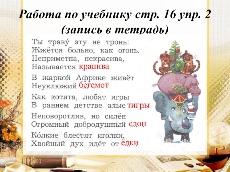 Работа по учебнику стр. 16 упр. 2 (запись в тетрадь)Крапива, бегемот, тигры, слон, ёлки.