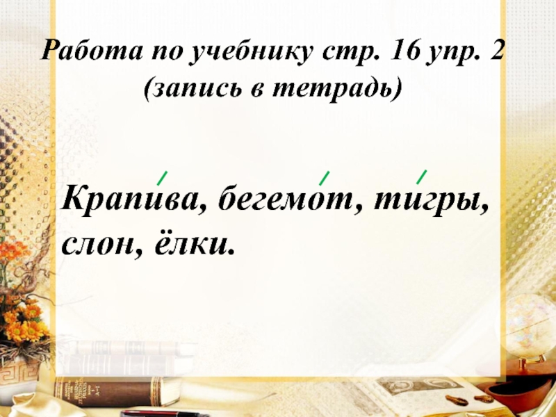 Работа по учебнику стр. 16 упр. 2 (запись в тетрадь)крапивабегемоттигрыслонёлки