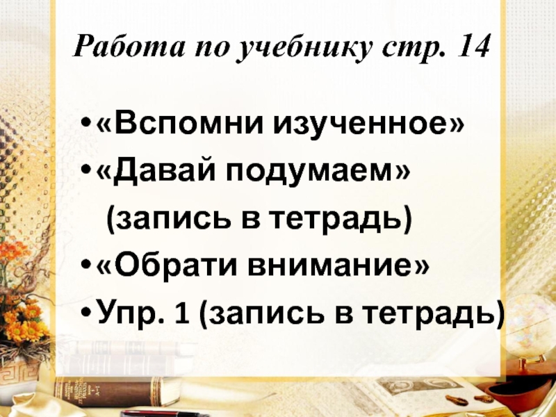 Работа по учебнику стр. 14«Вспомни изученное»«Давай подумаем»   (запись в тетрадь)«Обрати внимание»Упр. 1 (запись в тетрадь)
