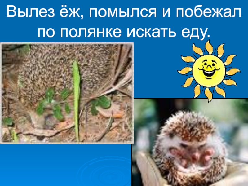 Слайд 21Вылез ёж, помылся и побежал по полянке искать еду.