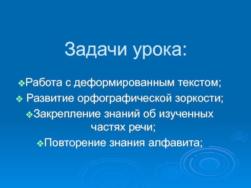 Задачи урока:Работа с деформированным текстом; Развитие орфографической зоркости;Закрепление знаний об изученных  частях речи;Повторение знания алфавита;