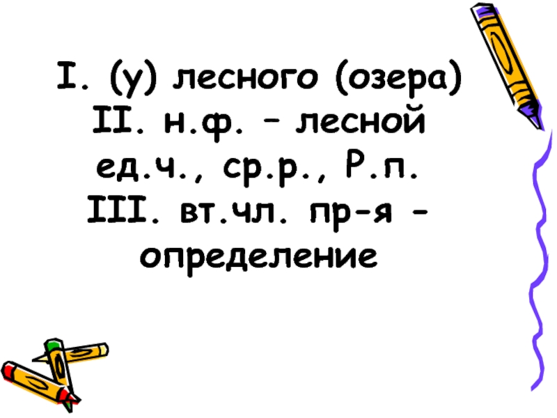 Слайд 25I. (у) лесного (озера) II. н.ф. – лесной ед.ч., ср.р., Р.п. III. вт.чл. пр-я