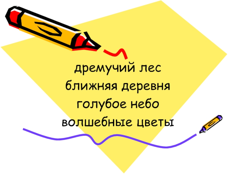 дремучий лес (ед.ч., м.р.)ближняя деревня (ед.ч., ж.р.)голубое небо (ед.ч., ср.р.)волшебные цветы (мн. ч.)