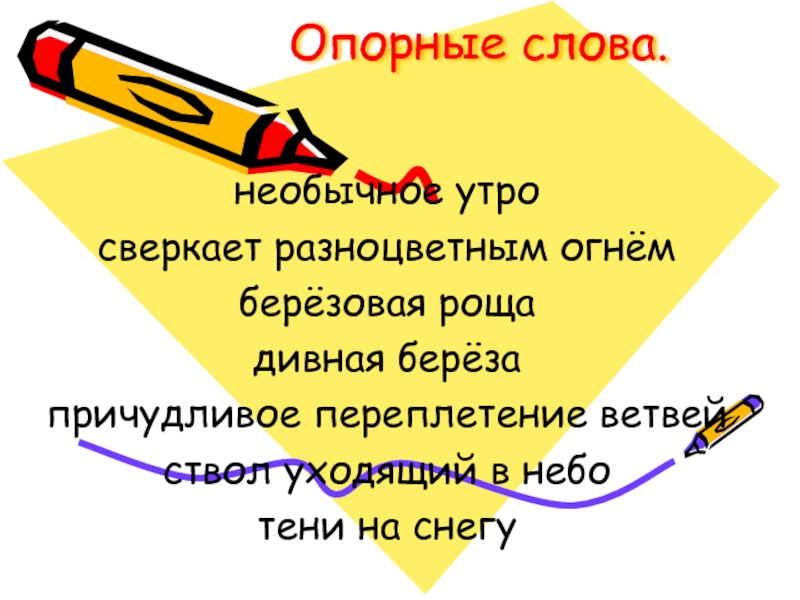 Опорные слова.необычное утросверкает разноцветным огнёмберёзовая рощадивная берёзапричудливое переплетение ветвействол уходящий в неботени на снегу
