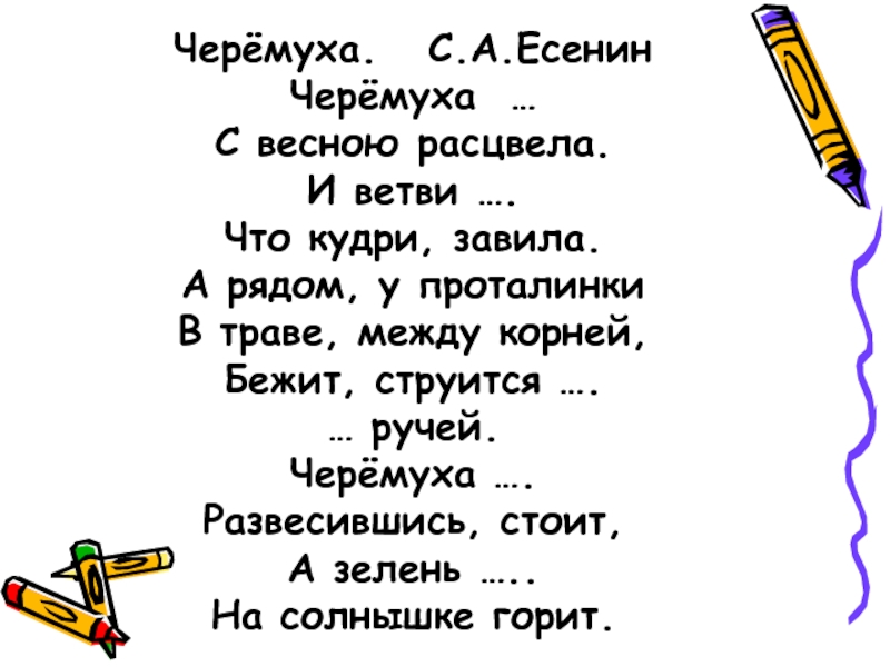 Слайд 3Черёмуха. С.А.Есенин Черёмуха … С весною расцвела. И ветви …. Что кудри, завила. А рядом,