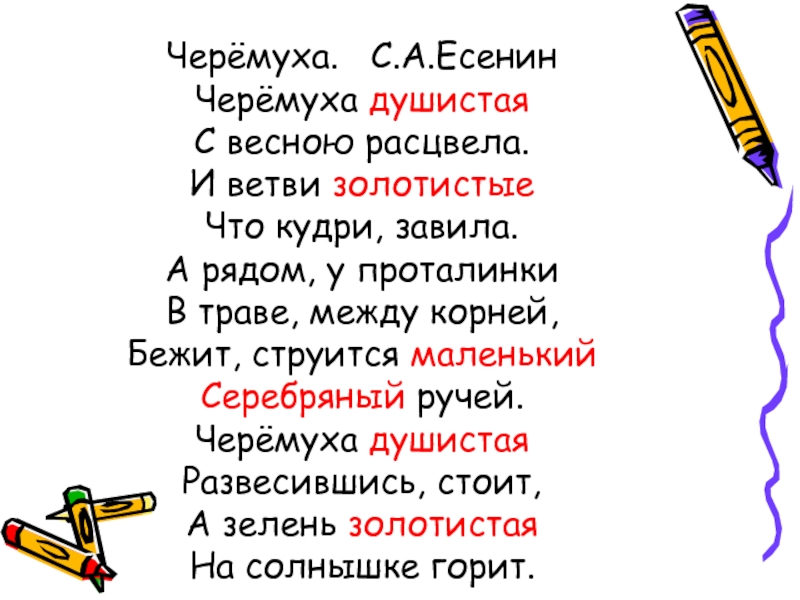 Слайд 6Черёмуха. С.А.Есенин Черёмуха душистая С весною расцвела. И ветви золотистые Что кудри, завила. А рядом,