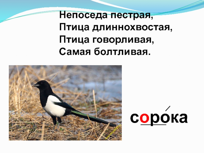 сорокаНепоседа пестрая, Птица длиннохвостая, Птица говорливая, Самая болтливая.