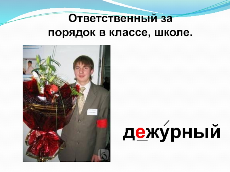 дежурныйОтветственный за порядок в классе, школе.