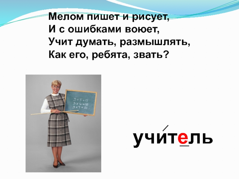 учительМелом пишет и рисует, И с ошибками воюет, Учит думать, размышлять, Как его, ребята, звать?