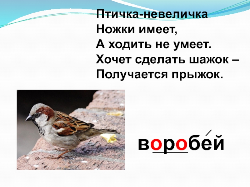 воробейПтичка-невеличка Ножки имеет, А ходить не умеет. Хочет сделать шажок – Получается прыжок.