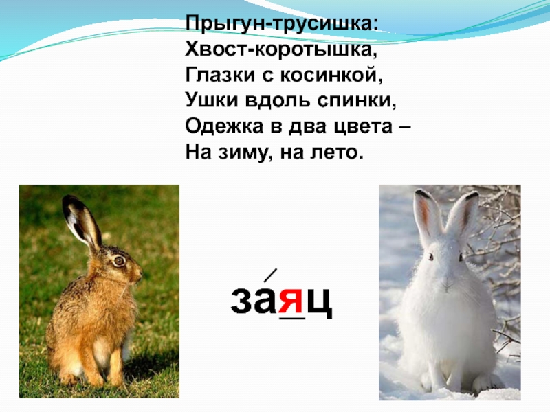 заяцПрыгун-трусишка: Хвост-коротышка, Глазки с косинкой, Ушки вдоль спинки, Одежка в два цвета – На зиму, на лето.