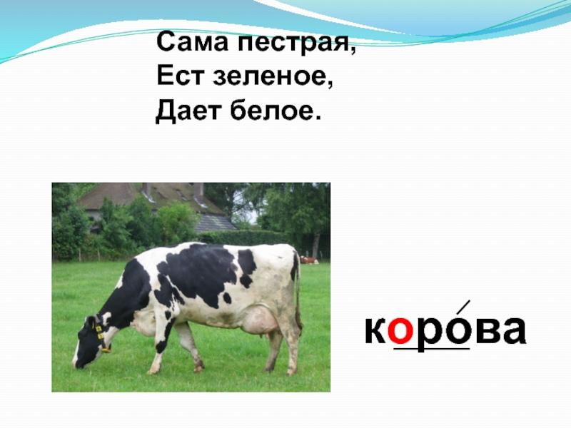 короваСама пестрая,  Ест зеленое,  Дает белое.
