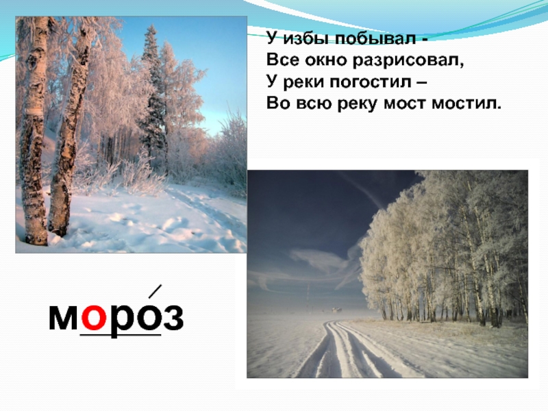 У избы побывал - Все окно разрисовал, У реки погостил – Во всю реку мост мостил. мороз