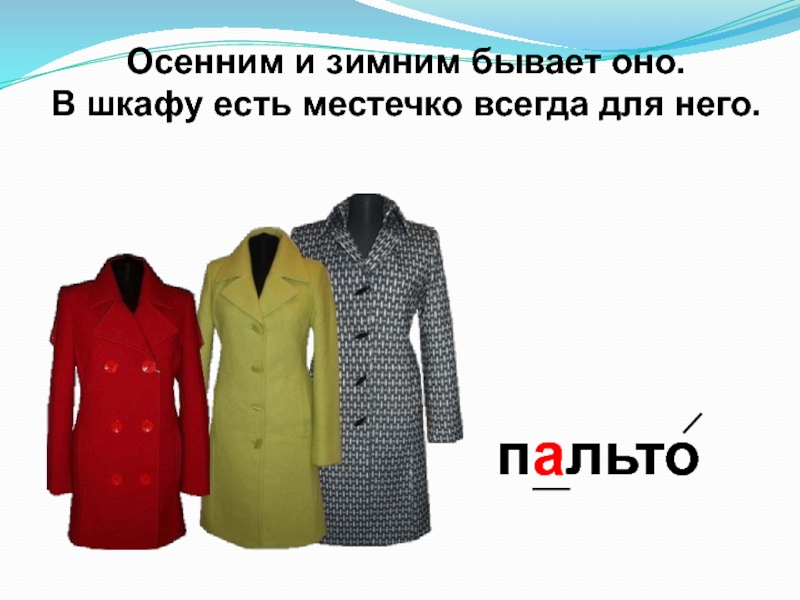 пальтоОсенним и зимним бывает оно.В шкафу есть местечко всегда для него.