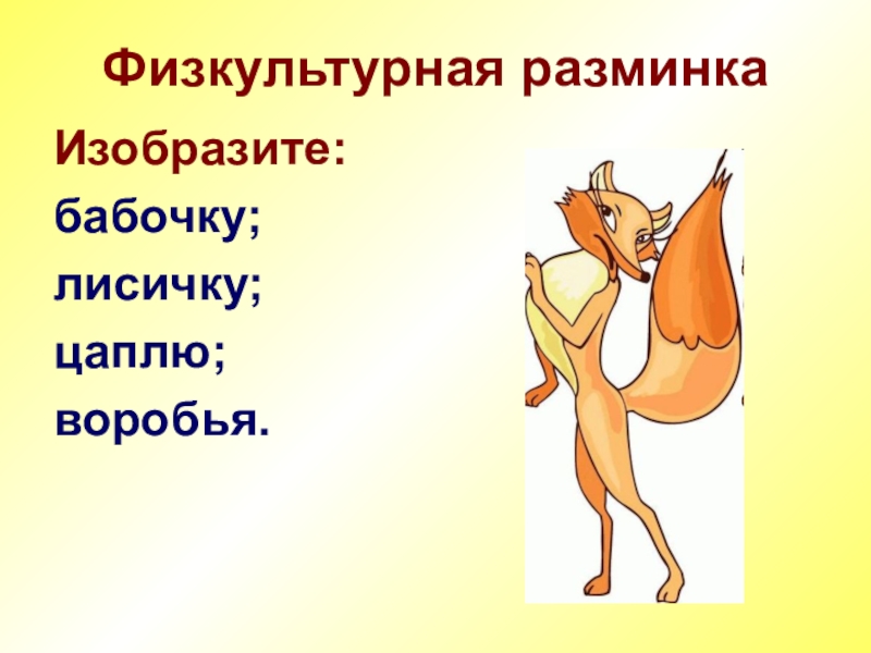 Физкультурная разминкаИзобразите:бабочку;лисичку;цаплю;воробья.