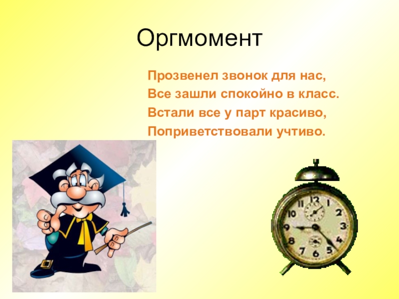 ОргмоментПрозвенел звонок для нас,Все зашли спокойно в класс.Встали все у парт красиво, Поприветствовали учтиво.