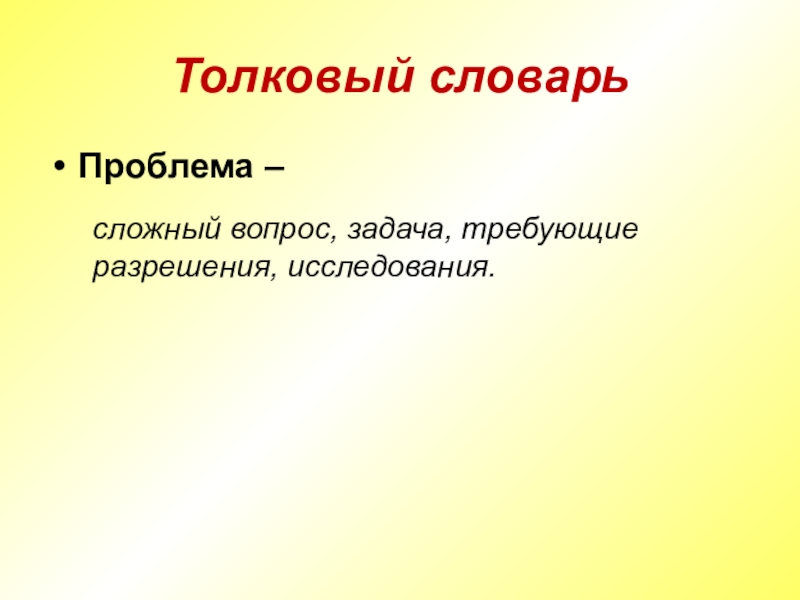 Толковый словарьПроблема – сложный вопрос, задача, требующие разрешения, исследования.