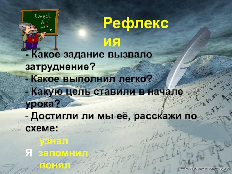 К, прилетели, кормушке, снегири, и , суетливые, красногрудые, синички.РефлексияРефлексия- Какое задание вызвало затруднение?- Какое выполнил легко?- Какую