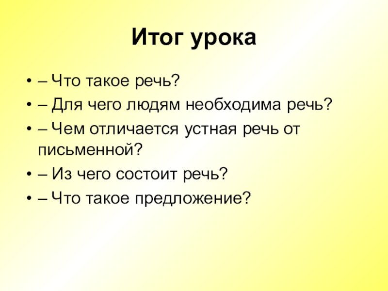 Итог урока– Что такое речь?– Для чего людям необходима речь?– Чем отличается устная речь от письменной?– Из