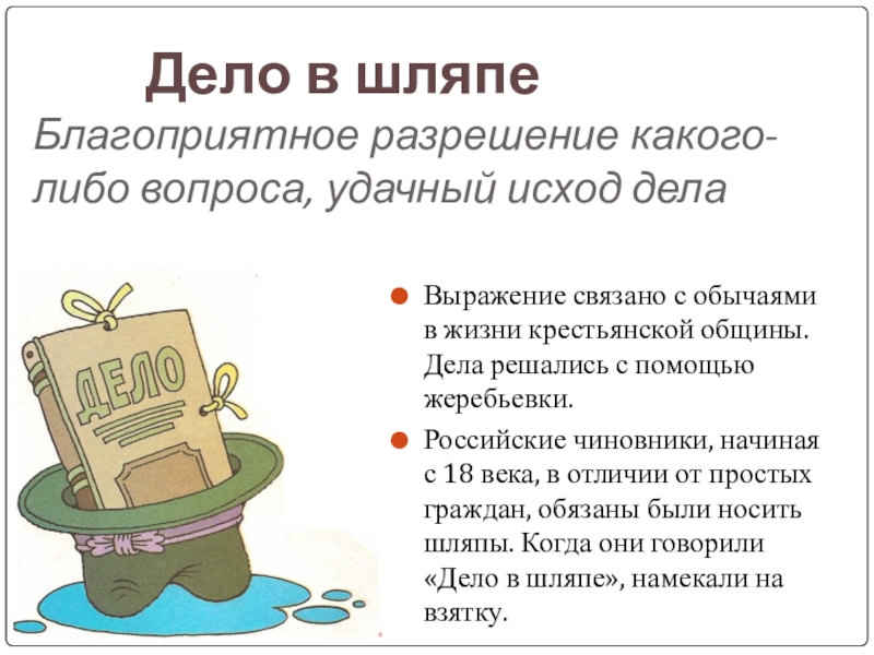 Российские чиновники, начиная с 18 века, в отличии от простых граждан, обязаны были носить шляпы. Когда они говорили «Дело в шляпе», намекали на взятку.
