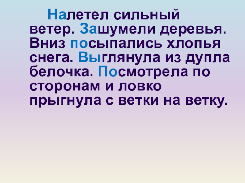 …летел сильный ветер. …шумели деревья. Вниз …сыпались хлопья снега. …глянула из дупла белочка. …смотрела по сторонам и ловко прыгнула с ветки на ветку.