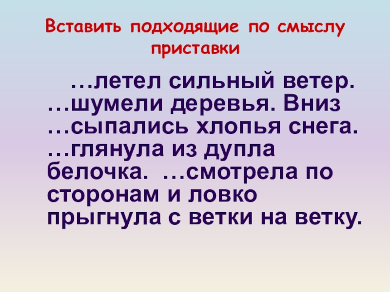 Слайд 19Вставить подходящие по смыслу приставки